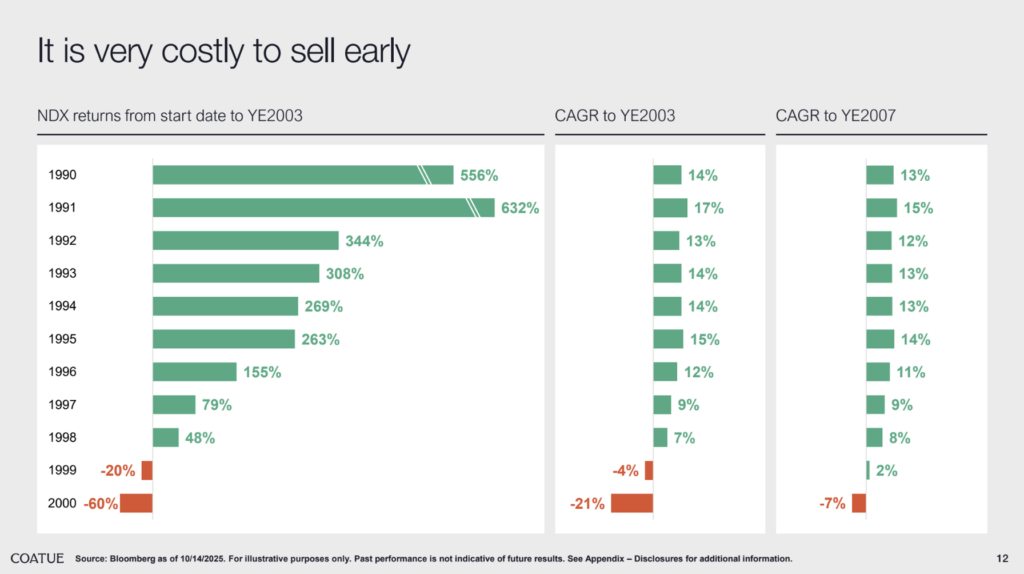 I came across an interesting chart the other day from Coatue Capital’s October 2025 investor update. They were making the case for staying invested and not getting out of the market too early. Else, the opportunity cost is too high. To prove their assertion, they picked the 1990’s bull market that ended with its peak in early 2000 and then slid down for the subsequent three years. If an investor had bought the NASDAQ-100 index (NDX) at the beginning of each year preceding the Y2K peak then held on until the end of the bear market (year-end 2003), what would be their gain or loss? This slide shows the numbers: