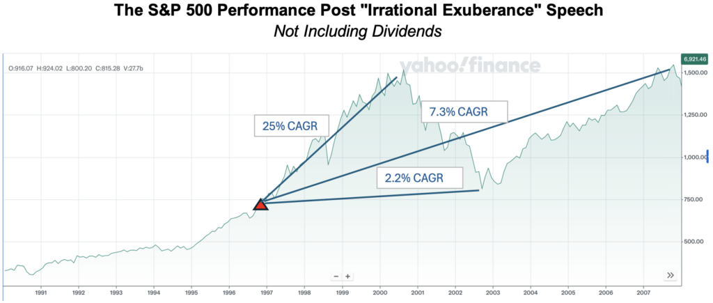Not just that, but investors who sold off at Greenspan’s warning hoping to buy back when prices were cheaper never got the chance. Even after the dot-com crash bottomed out in 2002, the S&P 500 was still trading higher than it was when Greenspan gave his warning.